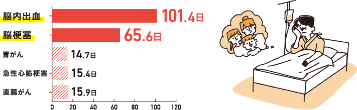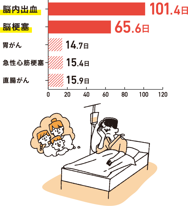 三大疾病のなかでも脳梗塞と脳内出血は入院期間が2か月、3か月を超える可能性があります。入院が長期化すると、治療や入院にかかる医療費だけでなく生活費や教育費、ローン返済などの心配も…